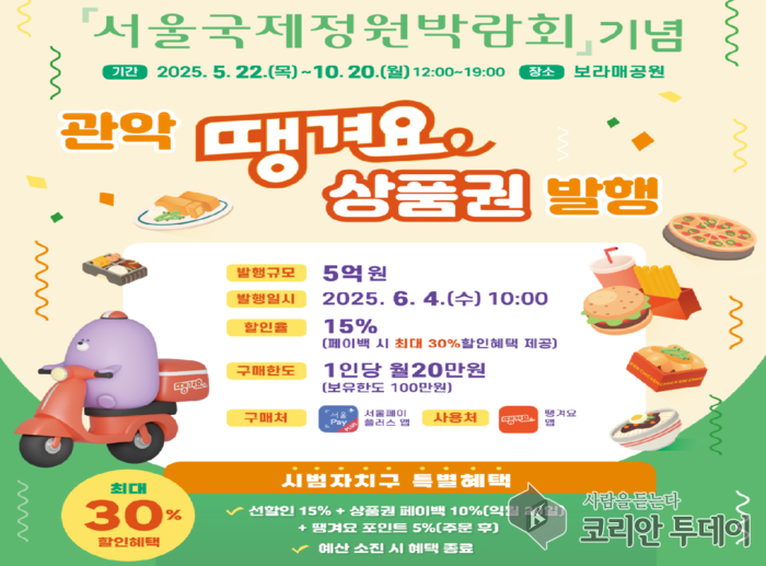 ![]() [코리안투데이] 서울국제정원박람회 기념 관악 땡겨요 상품권 발행 © 관악구청 제공 |