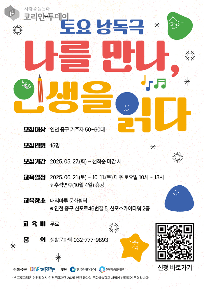 (재)인천중구문화재단이 생애전환기를 맞은 50~60대 중장년층을 위한 특별한 예술 프로그램 ‘토요 낭독극 – 나를 만나, 인생을 읽다’를 오는 6월 21일부터 운영한다. 이 프로그램은 인천시와 (재)인천문화재단이 후원하는 2025 인천 꿈다락 문화예술학교 사업의 일환으로, 중장년의 삶을 예술로 표현하는 기회를 제공한다.