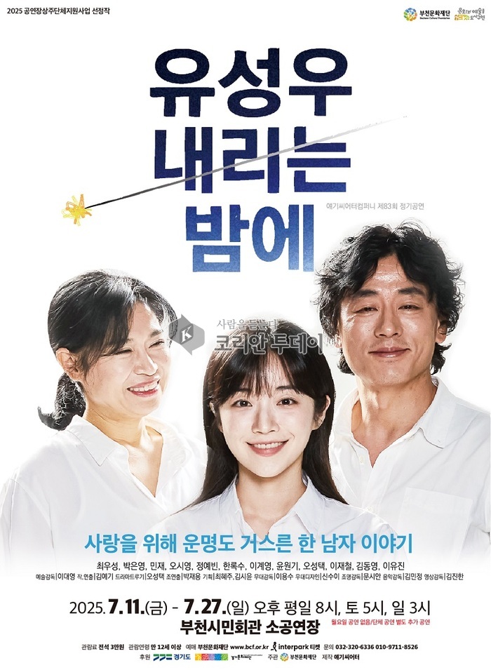 부천문화재단(대표이사 한병환, 이하 재단)은 2025년 경기예술지원 공연장상주단체지원사업의 일환으로 연극 <유성우 내리는 밤에>(얘기씨어터컴퍼니 제작)를 7월 11일(금)부터 27일(일)까지 부천시민회관 소공연장에서 무대에 올린다. 본 공연은 경기도와 경기문화재단의 지원을 받아 진행된다.