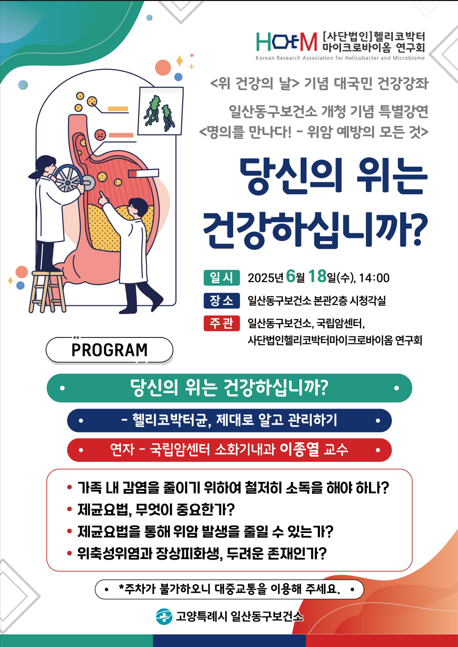 이번 강좌는 일산동구보건소 개청을 기념하는 첫 공식 건강 행사로, 지역 주민의 건강 증진을 위한 시작점으로 마련됐다. 사단법인 헬리코박터 마이크로바이옴 연구회, 국립암센터, 일산동구보건소가 공동 주최하며, 위암 예방과 관련한 최신 정보를 전달할 예정이다.