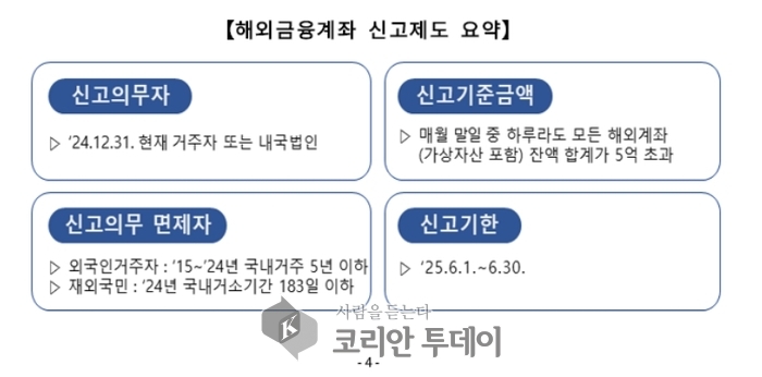 국세청은 지난달 말 발표한 보도자료를 통해 2024년 중 보유한 해외금융계좌 내 자산—현금, 주식, 채권, 가상자산 등—의 월말 잔액 중 하루라도 5억 원을 초과한 거주자 및 내국법인은 오는 6월 30일까지 반드시 이를 신고해야 한다고 밝혔다. 이는 기존 신고자라 하더라도 2024년 기준 5억 원 초과가 있었다면 다시 신고해야 하는 연례적인 의무사항이다.