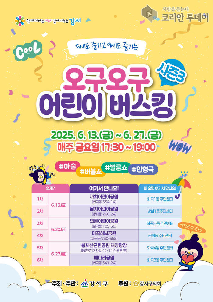 서울 강서구(구청장 진교훈)가 오는 6월 13일부터 27일까지 매주 금요일, 관내 어린이 공원 6곳을 순회하며 어린이와 가족이 함께 즐길 수 있는 거리 공연 ‘오구오구 어린이 버스킹’을 개최한다. ‘오구오구’는 5세도, 9세도 함께 즐긴다는 의미를 담은 이번 행사는 다세대·다가구 주거지가 밀집한 저층 주택 지역 어린이공원을 중심으로 기획돼, 가족들이 집 근처에서 손쉽게 문화공연을 접할 수 있도록 구성된 것이 특징이다.