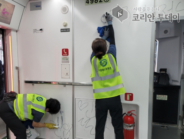 [코리안투데이] 열차내 불법낙서를 지우는 관계직원들(사진=서울교통공사제공) © 최영숙 기자