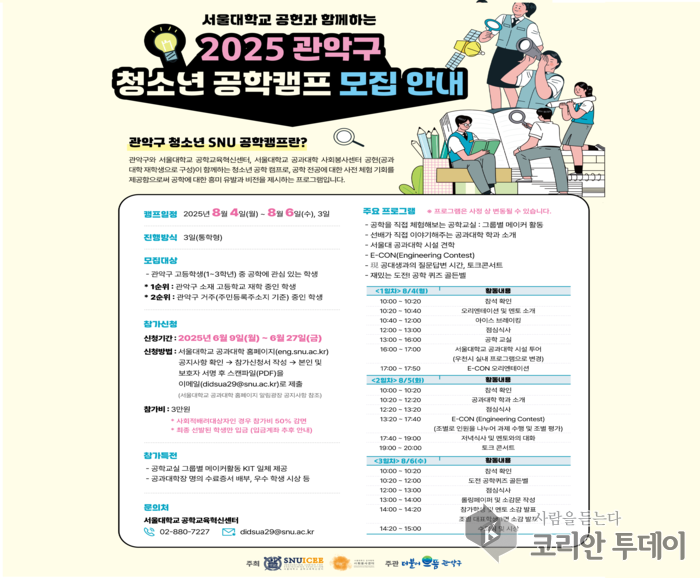 ![]() [코리안투데이] ‘2025 관악구 청소년 공학캠프’ 참가자 모집 안내 © 임희석 기자 |