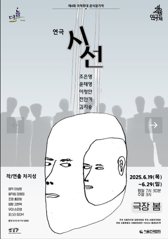 서울연극제와 함께하는 제4회 극적무대의 공식참가작 연극 <시선>이 2025년 6월 19일부터 29일까지 대학로 ‘극장 봄’ 무대에 오른다. 이번 작품은 관찰자 시점을 중심으로 인간 내면과 사회적 관계망을 탐구하는 실험극으로, 연출과 극작을 맡은 차지성 작가의 섬세한 시선이 돋보인다.