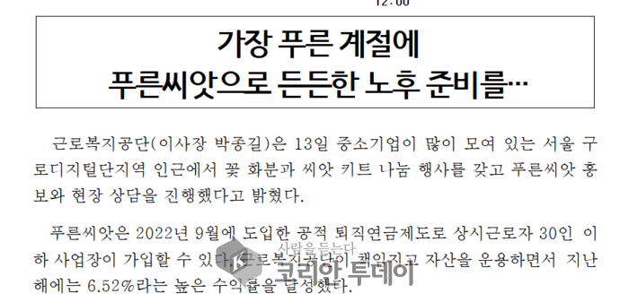 이제 노후 준비는 먼 이야기만은 아니다. 중소기업도, 저소득 근로자도, 푸른씨앗 하나면 든든한 노후를 꿈꿀 수 있다. 아직 늦지 않았다. 지금, 씨앗을 심을 시간이다.