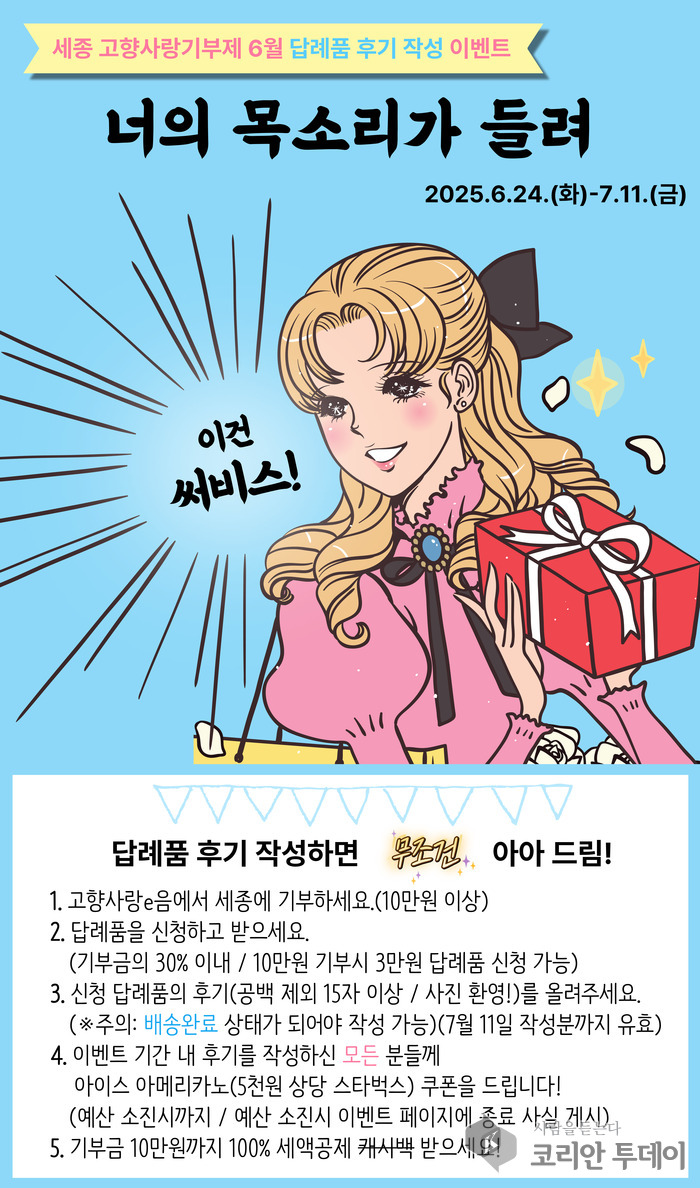 이번 후기를 통한 커피 쿠폰 증정 이벤트는 단순한 기부 장려를 넘어 지역사회와 기부자가 상생하는 모델로 주목받고 있다. 기부자에게 실질적인 혜택을 주는 동시에 세종시의 특색 있는 답례품을 전국적으로 알리는 계기가 될 것이다.