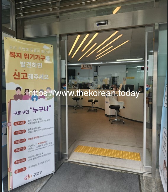 [코리안투데이] 사진 구로구 고척1동주민센터 입구에 설치된 ‘위기가구 신고 포상금 제도’ 안내 홍보 앞간판(배너) © 박수진 기자