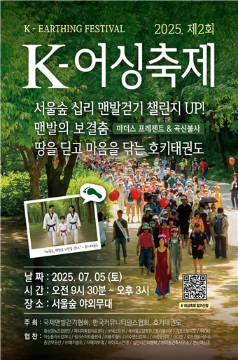 서울 성동구 서울숲에서 오는 7월 5일(토) 오전 9시 30분부터 오후 3시까지 제2회 ‘K-어싱 축제’가 개최된다. 국제맨발걷기협회는 1,000여 명 규모의 국내 최대 맨발걷기 축제를 전망하고 있다.