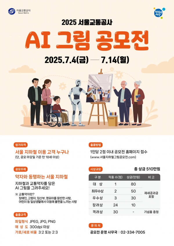 서울교통공사(이하 ‘공사’)는 AI 창작 열풍에 발맞춰 시민을 대상으로 ‘2025 서울교통공사 AI 그림 공모전’을 개최한다고 밝혔다. 공모 기간은 오는 4일부터 14일 자정까지다.공모 주제는 ‘약자와 동행하는 서울 지하철’이다. 장애인‧고령자‧임산부‧어린이 등 교통약자와 지하철을 함께 담은 따듯한 이미지를 생성형 AI를 활용해 그림을 창작하면 된다.