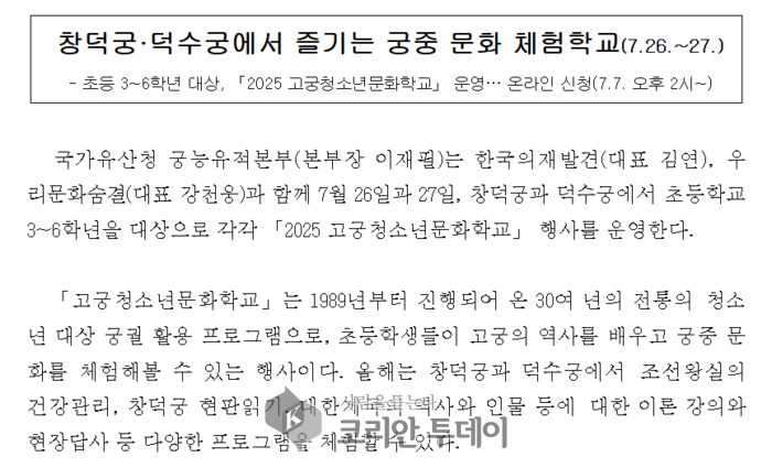 조선시대의 궁중 생활을 직접 체험할 수 있는 특별한 여름 프로그램이 마련됐다. 문화재청 궁능유적본부와 한국의집이 공동으로 주최하는 ‘2025 고궁청소년문화학교’가 오는 7월 26일부터 27일까지 양일간 창덕궁과 덕수궁에서 열린다. 이번 행사는 여름방학을 맞은 청소년들이 궁궐이라는 살아 있는 역사 현장에서 조선의 문화를 생생하게 체험할 수 있도록 기획된 것으로, 역사와 예술, 놀이가 결합된 고품격 문화 체험의 장이 될 전망이다.