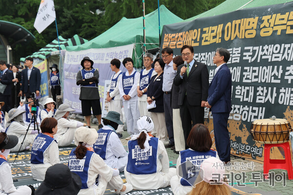 [코리안 투데이] 우원식 국회의장이 6월 27일 오전 국회 정문 앞에서 오체투지 농성 중인 전국장애인부모연대를 면담하고 농성 현장을 찾아 발달장애인 부모들을 위로했다.ⓒ국회  © 두정희 기자