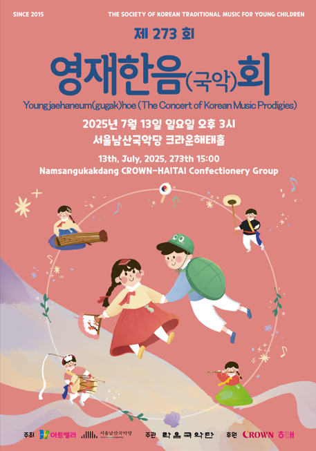 어린이 국악 영재들이 선사하는 정통 국악 무대, 제273회 <영재한음(國樂)회>가 2025년 7월 13일(일) 오후 3시, 서울남산국악당 크라운해태홀에서 개최된다. ‘아트팩토리 물’, 서울남산국악당, 국악방송이 공동으로 주관하고, 크라운해태가 후원하는 이 공연은 어린이들이 직접 무대에 올라 진정성 있는 우리 소리를 선보이는 의미 있는 자리다.