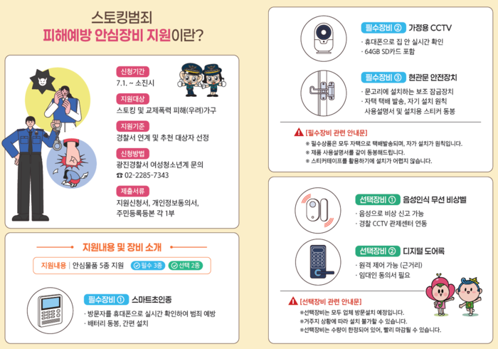 이번 사업은 7월 1일부터 예산 소진 시까지 진행되며, 안심장비 지원을 희망하는 주민은 광진경찰서 여성청소년계에 신청하면 된다. 문의는 광진경찰서 여성청소년계(☎02-2285-7343) 또는 광진구청 가정복지과(☎02-450-7566)를 통해 가능하다.