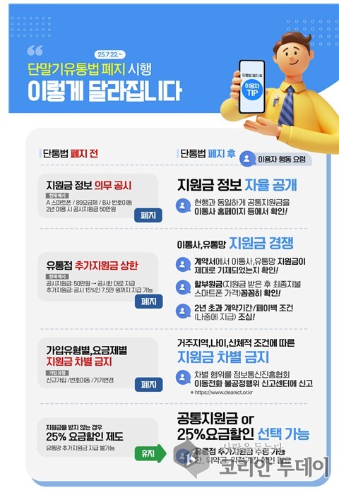 오는 7월 22일부터 「이동통신단말장치 유통구조 개선에 관한 법률(단말기유통법)」이 폐지되며, 이동통신 시장이 자유경쟁 체제로 전환된다. 이에 따라 이동통신사들의 단말기 지원금 공시 의무가 사라지고, 대리점과 판매점 등 유통점이 자율적으로 정하는 추가지원금 상한도 폐지된다. 과학기술정보통신부와 방송통신위원회는 이번 제도 개편이 이동통신사 및 유통점 간의 경쟁을 유도해 소비자 혜택이 확대될 것으로 기대하고 있다.