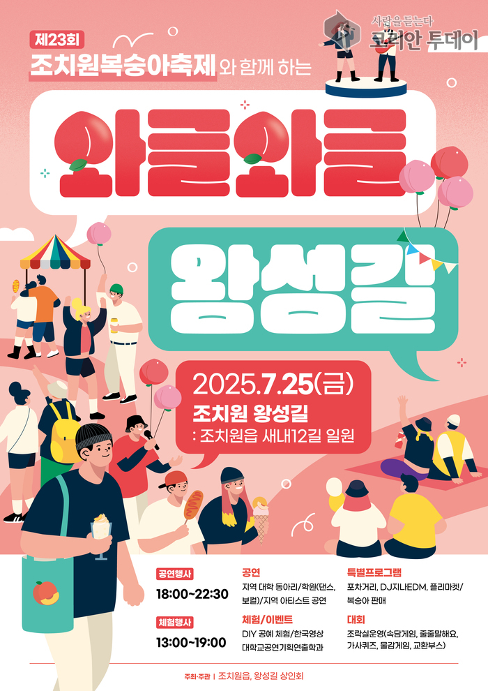 세종시 조치원읍이 오는 25일 조치원복숭아축제와 함께 ‘와글와글 왕성길 축제’를 개최한다. 이번 행사는 조치원 왕성길 일원을 중심으로 낮 1시부터 밤 자정까지 이어지는 도심형 거리축제로, 본격적인 여름철 복숭아 수확 시즌을 맞아 지역상권에 생기를 불어넣는 데 목적을 둔다. 특히 축제는 밤마실 콘셉트를 도입해 시민들이 시원한 여름 밤을 음악, 먹거리, 문화체험과 함께 즐길 수 있도록 구성했다.