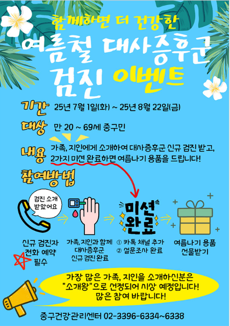 서울 중구가 7월 1일부터 8월 22일까지 대사증후군 무료 검진 이벤트를 진행한다. 가족이나 지인과 함께 검진을 받으면 선착순 300명에게 여름나기 용품을 제공하며, 검진 결과에 따라 분야별 맞춤 건강상담도 함께 진행된다.