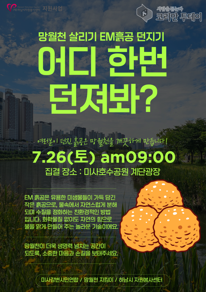 이번 행사는 ‘어디 한번 던져봐?’라는 기발한 슬로건 아래, 하남시민 누구나 참여할 수 있도록 기획된 환경 정화 프로젝트다. 시민들은 EM흙공을 직접 던지며 수질을 정화하고, 생태계를 보호하는 뜻깊은 체험을 할 수 있다.