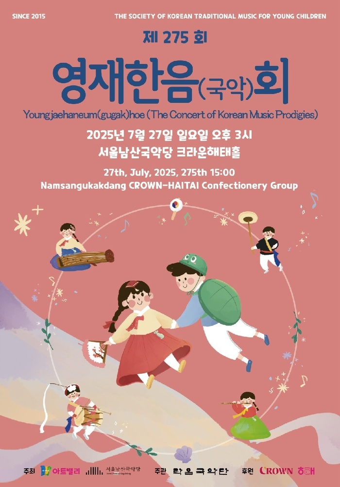 제275회 영재한음(국악)회가 7월 27일(일) 오후 3시, 서울남산국악당 크라운해태홀에서 열린다. 이번 공연은 (사)한국전통어린이국악협회가 주최하고, 아트밸리와 서울남산국악당이 공동으로 주관하며, 크라운해태가 후원한다.