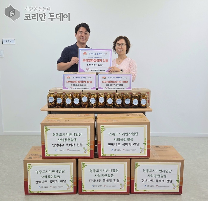 (인천=코리안투데이 인천남부) 인천시 중구자원봉사센터는 행정안전부가 추진하는 ‘온기 나눔 캠페인’에 동참하며 지역사회 소외계층을 위한 따뜻한 나눔 활동을 실천했다. 7월 31일, 센터는 청소년 자원봉사자들과 영종도시기반사업단 직원들이 정성껏 만든 ‘오이양파장아찌’와 ‘편백나무 목베개’를 중구청 복지서비스팀에 전달했다고 밝혔다.