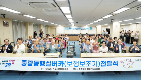 중랑구(구청장 류경기)가 어르신들의 안전한 외출을 지원하고 사회참여를 독려하기 위해 ‘중랑동행 실버카’ 보행보조기 대여 사업을 본격 추진한다. 구는 지난 7월 24일 중랑구청에서 실버카 전달식을 개최하며 본 사업의 시작을 공식화했다. 전달식에는 류경기 중랑구청장을 비롯해 (사)대한노인회 중랑구지회장, 지역 내 노인복지관 관장 4명, 구립경로당 회장 39명 등 약 50여 명이 참석했다. 행사는 사업 소개, 실버카 전달, 구청장 인사말, 기념촬영 등의 순으로 진행되었으며, 실버카의 실물도 현장에서 공개되어 참석자들의 관심을 끌었다.