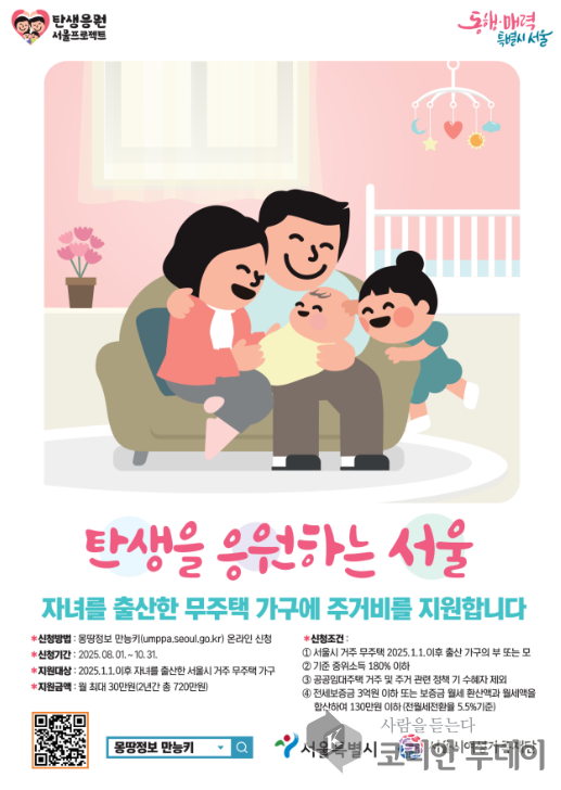 지원 대상은 202511일 이후 자녀를 출산한 서울시 거주 무주택 가구이다. 지원금은 월 최대 30만 원으로 2년간 총 720만 원을 지원한다. 신청 조건은 서울시 거주 무주택 가구, 202511일 이후 출산, 기준 중위소득 180% 이하, 공공임대주택 거주 및 주거 관련 정책 수혜자 제외, 전세보증금 3억 원 이하 또는 월세 환산액 130만 원 이하(전월세전환율 5.5% 기준)이다.