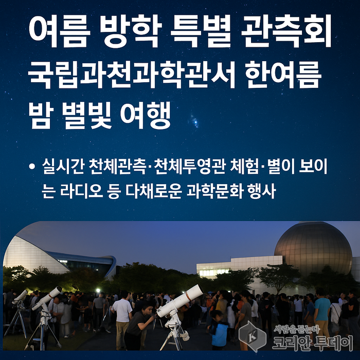 관계자는 “이번 특별 관측회는 여름철 별빛이 가장 아름다운 시기에 맞춰 준비한 만큼, 참가자들이 가족이나 친구와 함께 잊지 못할 추억을 쌓길 기대한다”며 “앞으로도 다양한 과학문화 프로그램을 지속적으로 기획해 국민들의 과학문화 향유 기회를 확대하겠다”고 밝혔다.