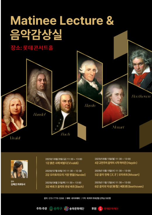 서울 송파구(구청장 서강석)가 클래식 음악에 대한 대중적 이해도를 높이고자, 해설과 감상이 결합된 <2025 마티네 렉처&음악감상실>을 오는 11월까지 롯데콘서트홀에서 운영 중이다.