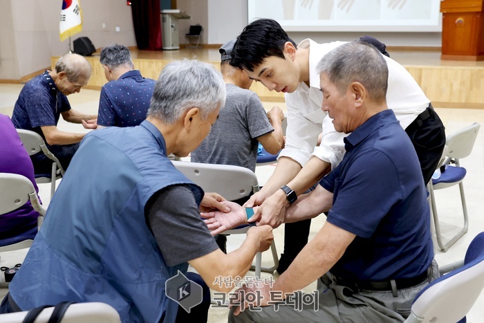 [코리안투데이] 지난 7일 성동구 근로자를 대상으로 실시한 테이핑교육 실습하는 모습 © 손현주 기자