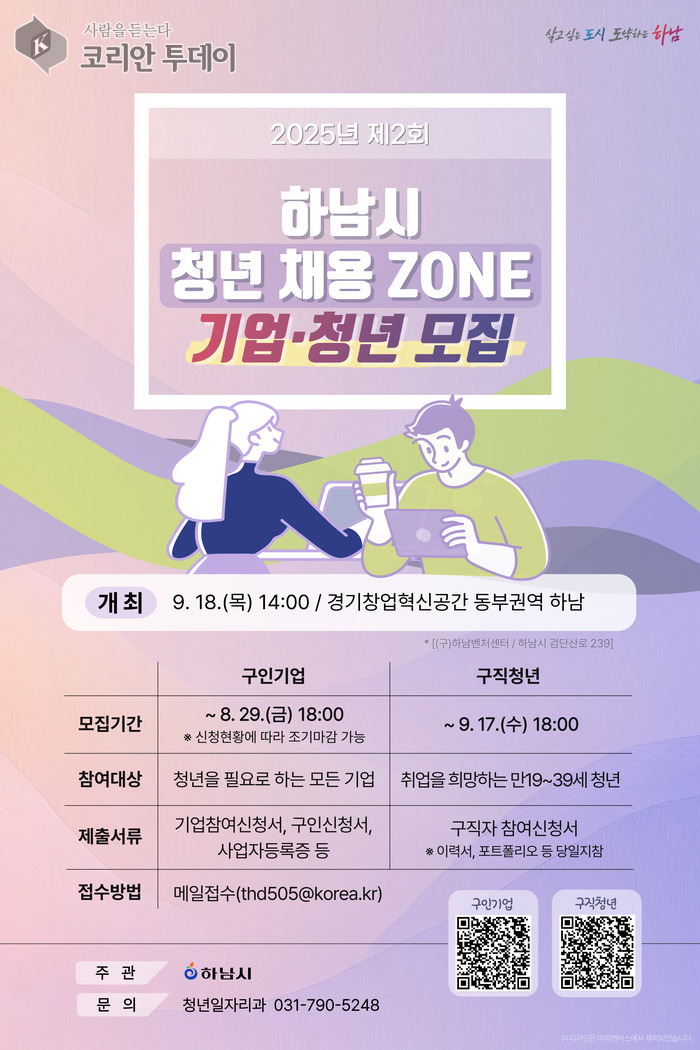 하남시(시장 이현재)‘2025년 제2회 하남시 청년 채용존(ZONE)’에 참여할 우수 기업과 청년 구직자를 모집한다. 이번 행사는 918() 오후 2, 경기창업혁신공간 동부권역 하남 3(하남시 검단산로 239)에서 열린다.