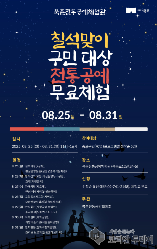 종로구(구청장 정문헌)가 2025년 음력 칠월칠석(양력 8월 29일)을 기념해 북촌전통공예체험관(북촌로12길 24-5)에서 「칠석맞이 주민친화행사」를 개최한다. 이번 행사는 전통공예의 우수성을 알리고 구민의 문화예술 향유 기회를 넓히기 위해 마련됐으며, 북촌전통공방협의회 주관으로 8월 25일부터 31일까지 7일간 진행된다.