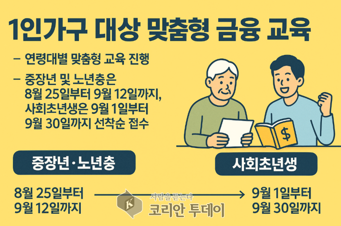 구로구(구청장 장인홍)가 관내 1인 가구를 대상으로 맞춤형 금융교육을 실시한다. 자산관리 방법과 금융사기 피해 예방 방법 등 금융교육을 제공함으로써, 1인 가구가 경제적으로 안정적이고 여유로운 생활을 할 수 있게 하고자 마련했다. 교육은 중장년·노년(시니어) 맞춤형 금융교육과 사회초년생 맞춤형 금융교육 2개로 나뉘어 진행된다.