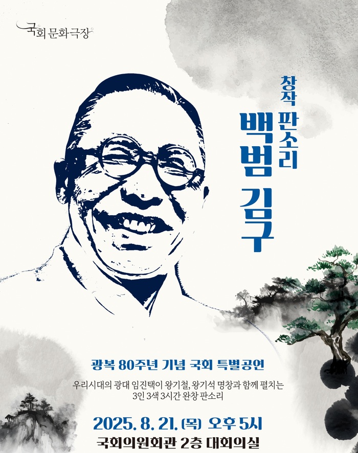 광복 80주년을 기념하는 창작 판소리 ‘백범 김구’가 오는 8월 21일(목) 오후 5시, 국회의원회관 2층 대회의실에서 국회 문화극장 주최로 특별 공연된다. 이번 공연은 독립운동가 김구 선생의 생애를 예술로 조명하는 창작 판소리 무대로, 초점 키프레이즈인 창작 판소리 백범 김구를 통해 전통 예술과 역사적 의미가 결합된 무대를 선보인다.