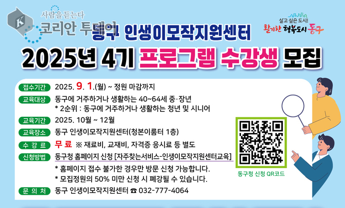 (인천=코리안투데이 인천남부) 인천 동구(구청장 김찬진) 인생이모작지원센터가 중장년층의 재도전과 자기계발을 위한 ‘2025년 4기 동구 인생이모작지원센터 프로그램’ 수강생을 오는 9월 1일부터 모집한다고 밝혔다. 이번 프로그램은 10월부터 12월까지 총 3개월간 운영되며, 취·창업 지원, 역량 강화, 사회공헌, 취미, 체험, 특강 등 다양한 교육 과정으로 구성된다.