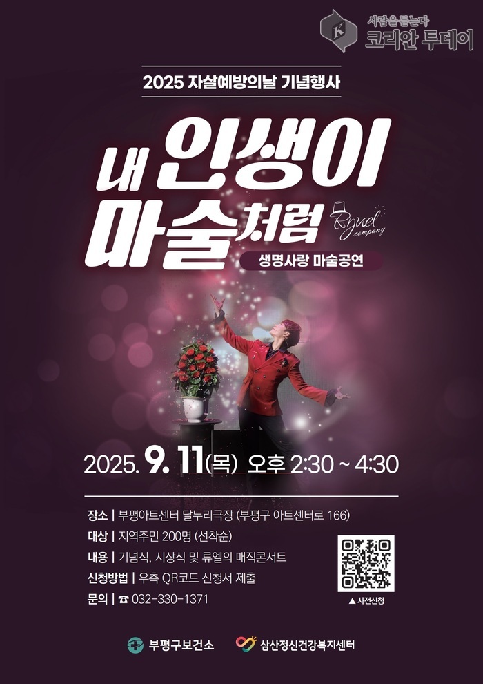 부평구 삼산정신건강복지센터가 ‘세계 자살예방의 날’을 맞아 오는 11일 오후 2시 30분 부평아트센터 달누리극장에서 생명사랑 마술공연 ‘내 인생이 마술처럼’을 진행한다. 이번 공연은 일상 속 스트레스와 심리적 부담으로 지쳐 있는 주민들에게 위로와 희망의 메시지를 전하고, 생명의 소중함을 함께 되새기기 위해 마련됐다. 센터는 문화공연 형식의 접근으로 주민 참여 문턱을 낮추고, 정신건강 인식 개선과 자살예방의 지역사회 공감대를 넓히겠다는 취지를 밝혔다.