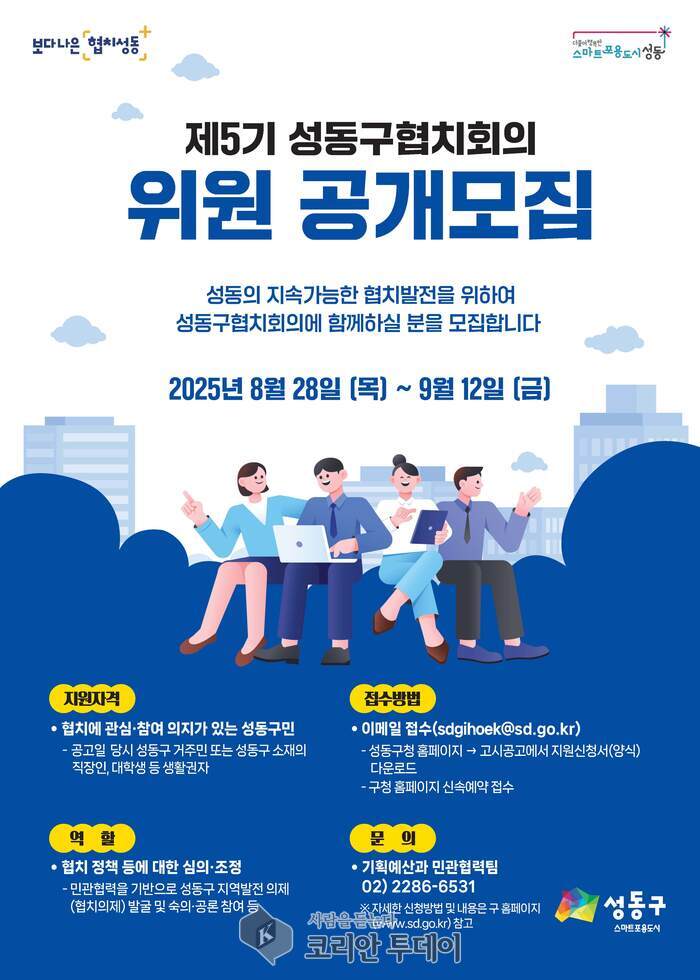 서울 성동구(구청장 정원오)가 주민과 함께하는 민관협력 거버넌스 강화를 위해 ‘제5기 성동구협치회의’ 위원 공개 모집에 나섰다. 모집 기간은 8월 28일부터 9월 12일까지 총 15일간이며, 모집 인원은 총 11명 내외다.