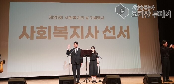 ![]() [코리안투데이] (사진) 제25회 사회복지의 날 기념행사에서 사회복지사 선서를 하고 있다.© 박수진 기자 |