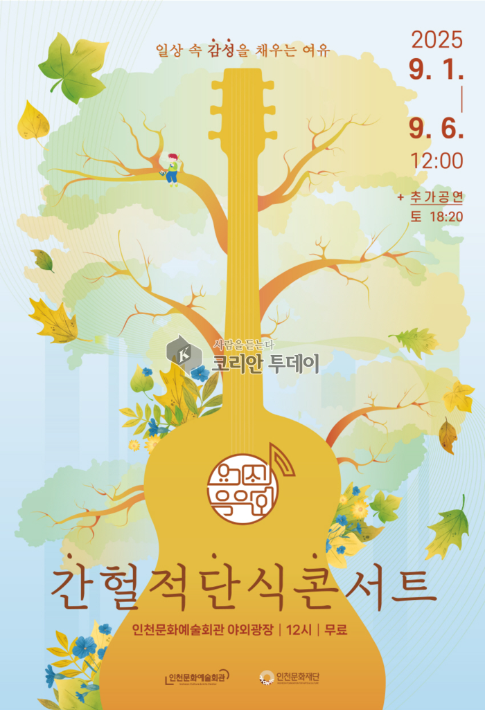 홍순미 인천문화예술회관장은 “청명한 가을 하늘 아래 잠시 걸음을 멈추고 음악에 몸을 맡기는 시간이 되길 바란다”며 “지역 뮤지션과의 협력을 이어가 시민과 가까이 호흡하는 무대를 지속하겠다”고 말했다.
