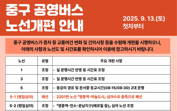 김정헌 중구청장은 “이번 공영버스 개편으로 학생들의 통학 편의를 증진함은 물론, 출퇴근 시간대 시내버스 부족 문제를 보완할 수 있을 것”이라며 “앞으로도 주민 의견을 적극 반영해 보다 안전하고 편리한 대중교통 환경을 조성하겠다”고 밝혔다.