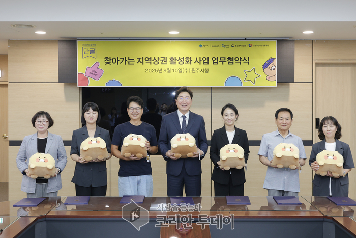 원주시가 카카오와 손잡고 지역상권 활성화를 위한 새로운 길을 열었다. 원주시는 10일 오후 4시 30분 시청 7층 회의실에서 ㈜카카오와 ‘찾아가는 지역상권 활성화 사업(카카오 프로젝트 단골)’ 협약을 체결하며 전통시장과 상점가 소상공인의 경쟁력 강화를 본격 추진했다. 이번 협약식에는 (사)함께만드는세상, 소상공인시장진흥공단, 도래미시장 상인회, 자유시장 번영회, 문화의거리 상인회도 함께 참여해 민관 협력의 폭을 넓혔다.