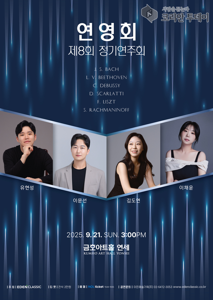 깊어가는 가을, 음악으로 만나는 클래식의 정수. 연영회 제8회 정기연주회가 2025년 9월 21일(일) 오후 3시, 서울 금호아트홀 연세에서 성황리에 개최되었다. 이번 연주회는 EDENCLASSIC 주최로 열렸으며, 국내 유망 피아니스트 4인이 참여해 시대별 거장들의 명곡을 선보였다.