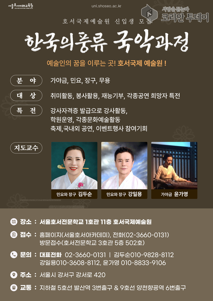 서울호서전문학교 산하 호서국제예술원이 전통 국악의 맥을 잇고 새로운 인재를 발굴하기 위해 한국의 흥류 국악과정 신입생을 모집한다. 이번 과정은 가야금, 민요, 장구, 무용 등 한국 고유의 전통 예술을 배우고자 하는 이들을 위한 맞춤형 프로그램으로 구성되었다.