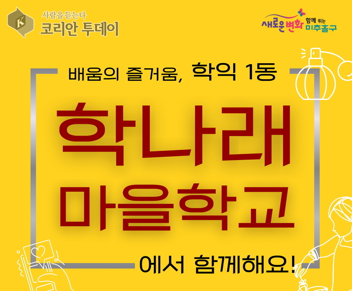 (인천=코리안투데이 인천남부) 인천 미추홀구 학익1동 주민자치회(회장 이상기)가 지역 주민들의 삶의 질 향상과 이웃 간 소통을 도모하기 위해 오는 9월 ‘학나래 마을 학교’ 프로그램을 운영하고 참여자를 모집한다.