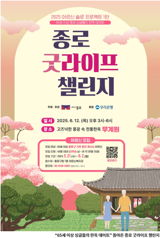 종로구(구청장 정문헌)가 홀로 사는 어르신들의 사회적 고립을 해소하고 새로운 인연을 응원하는 특별한 만남의 자리를 마련한다. 구는 오는 6월 12일 전통문화공간 무계원(창의문로5가길 2)에서 「2025 어르신 솔로 프로젝트 1탄: 종로 굿라이프 챌린지」를 개최한다고 밝혔다.