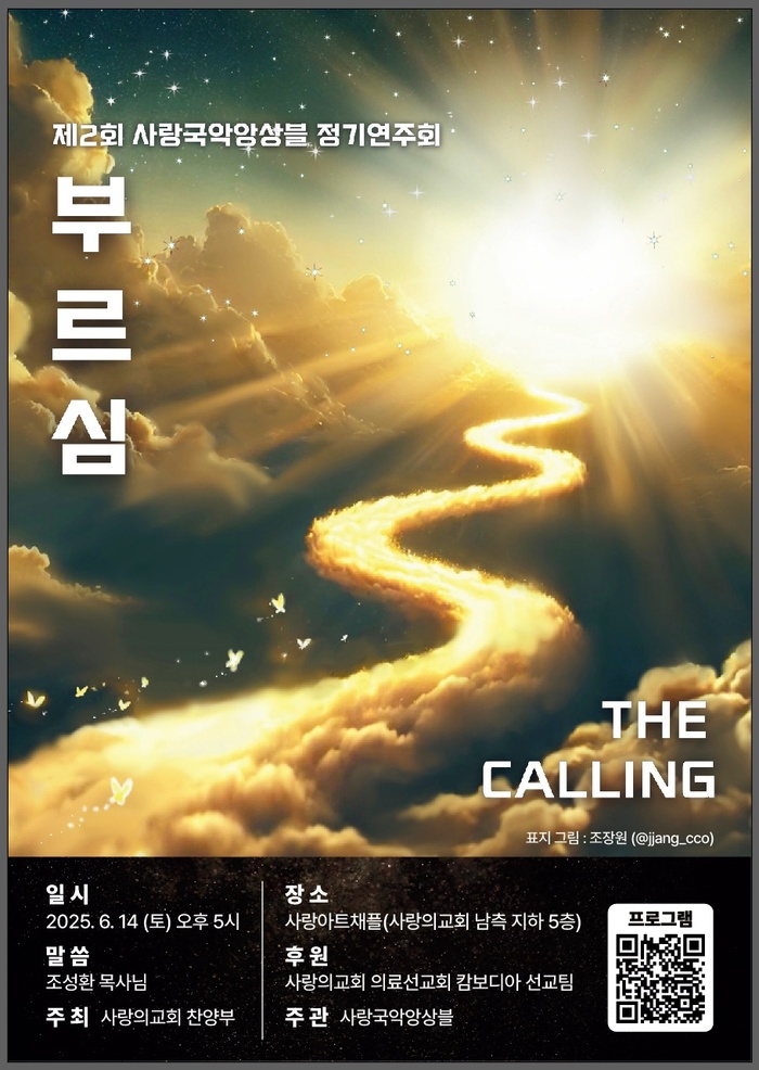 사랑의교회 의료선교회 캄보디아 선교팀 후원으로 열리는 이번 공연은 무료 초대로진행되며, 문의는 사랑국악앙상블 이진경 단장(010-3230-4797)에게 하면 된다. 한국 전통음악의 깊은 울림과 현대적 감각이 조화된 ‘부르심’ 무대는 교회와 지역 사회에 풍성한 은혜를 전할 예정이다.