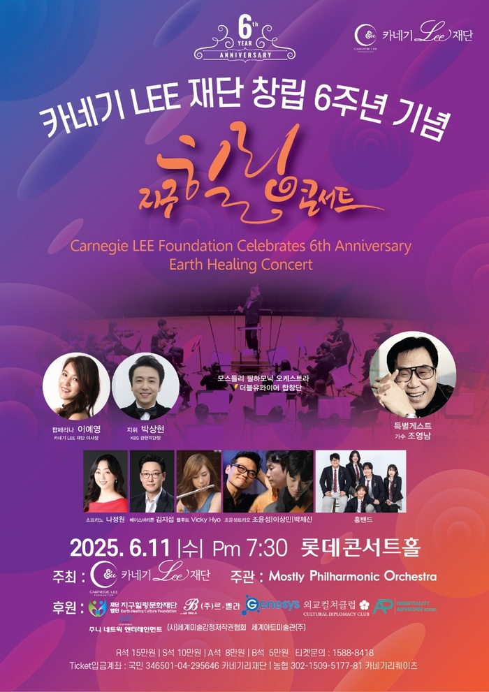 카네기 LEE 재단이 창립 6주년을 맞아 특별한 음악회 ‘지구 힐링 콘서트’를 개최한다. 이번 공연은 오는 2025년 6월 11일(수) 오후 7시 30분, 서울 롯데콘서트홀에서 열리며, 클래식과 대중음악이 함께 어우러진 감동적인 무대를 통해 지구와 인간, 공존의 메시지를 전한다.