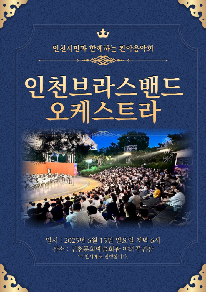 이번 음악회에서는 대중들에게 익숙한 클래식 명곡부터 영화음악, 팝 등 다양한 장르의 곡들이 연주될 예정으로, 남녀노소 누구나 즐길 수 있는 무대가 펼쳐진다. 인천시 관계자는 “브라스밴드의 열정적인 선율과 함께 가족, 연인, 친구들과 추억을 만들 수 있는 시간이 될 것”이라며 “우천시에도 예정대로 공연이 진행되니 많은 참여 바란다”고 전했다.