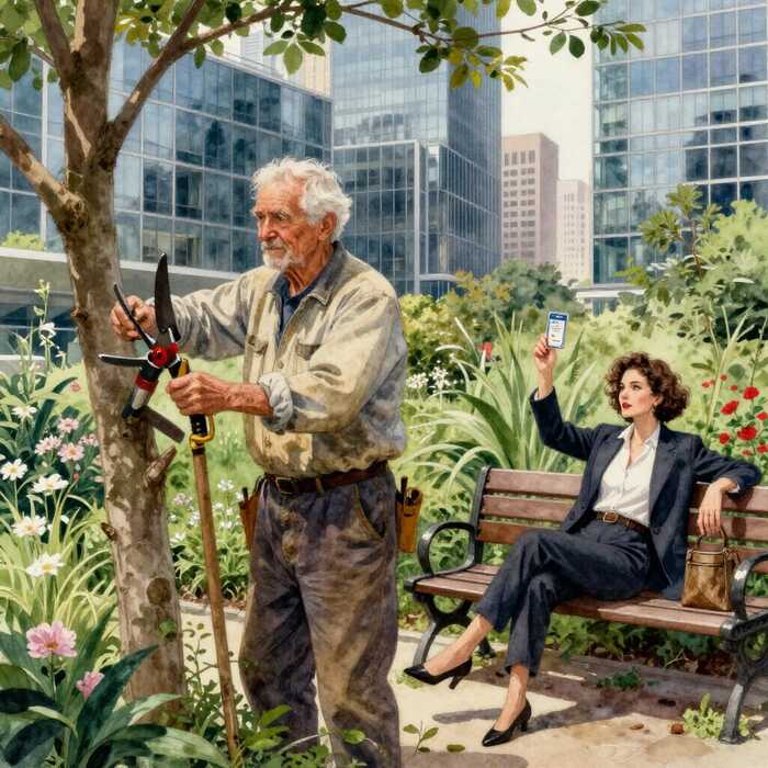 그 곁에서 백발의 노인 하나가 묵묵히 나무를 손질하고 있었습니다. 낡은 작업복을 입고 허리를 굽힌 채 잔가지를 치는 그의 손길은 느렸지만 단정하고 정성스러웠습니다. 그것은 누군가에게 보이기 위한 동작이 아니라, 자신이 맡은 생명을 다루는 자 특유의 경건한 태도였습니다. 하지만 여인의 눈에 비친 노인은 그저 ‘공부 안 해서 늙어서까지 고생하는 노인’일 뿐이었습니다. 여인은 아이의 코를 닦아준 휴지를 마치 허공에 던지듯 노인 쪽으로 툭 떨어뜨렸습니다. 바람을 타고 날아온 쓰레기를 노인은 말없이 주워 쓰레기통에 넣었습니다. 하지만 여인은 보란 듯이 또 하나의 휴지를 던졌습니다. 그것은 우연이 아니라 명백한 의도가 담긴, 타인의 노동을 시험하고 모욕하는 반복이었습니다.