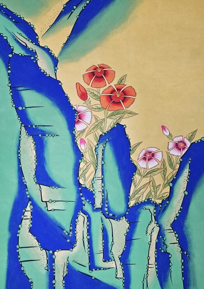 이번 전시에 출품된 임은영의 작품은 전통 민화의 상징성과 서사를 유지하면서도 현대적 색채와 구성을 통해 동시대성과 예술성을 동시에 구현한다. 첫 번째 작품에서는 선인장 형태의 괴석 위에 피어난 꽃이 강한 색채 대비와 세밀한 필선으로 표현되며 생명력과 강인함을 상징한다. 두 번째 작품은 기괴하면서도 아름다운 괴석 위에 수많은 나비들이 모여드는 장면으로, 자연과 인간의 이상적 조화를 암시한다. 세 번째와 네 번째 작품은 각각 청룡과 황룡을 그린 민화적 상징화로, 용의 역동성과 신성함을 강렬한 붓질과 색채로 시각화하고 있다.