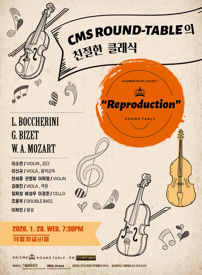 2026년 1월 28일, 클래식 음악 애호가들의 귀와 마음을 사로잡을 공연이 예술의전당에서 열린다. 바로 CMS ROUND-TABLE이 선보이는 시리즈 ‘친절한 클래식: Reproduction’이다. 이번 공연은 음악적 깊이와 대중성과 해설이 조화롭게 어우러지는 무대로, 고전 음악을 현대적 감성으로 재생산하는 시도를 담고 있다. 프로그램에는 L. Boccherini, G. Bizet, W. A. Mozart 등 고전 거장들의 대표 작품이 포함되어 있다.